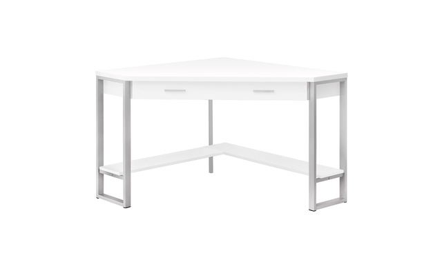 Turn the corner of your home office into a stylish workspace with this computer desk in a white finish. Its angular design saves space by fitting snugly in a corner. The desktop provides ample space for a laptop or computer monitor, desk lamp, and essential supplies. Keep the desktop clutter free by placing letter- and legal-size papers in the storage drawer. To make opening and closing the extra-wide drawer easy, it features 2 handles and metal glides. The L-shaped bottom shelf offers additional storage space and can hold a computer tower. Providing stability is a metal frame with exposed, rectangular legs in a silver finish for a modern-industrial look.