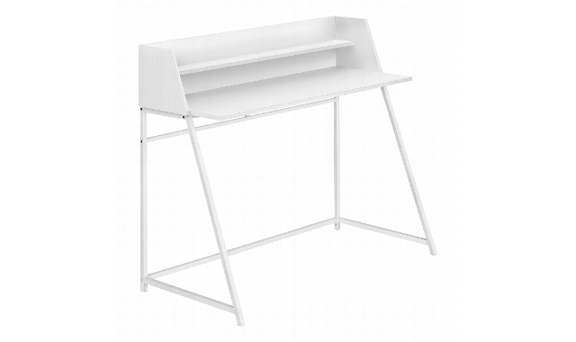 Look at your home office from a different angle with this computer desk featuring a storage hutch. Finished in a white laminate, the compact desktop has side panels that slant to seamlessly align with the attractive, trapezoid-shaped metal legs for a clean look. The hutch includes 1 long shelf that is the ideal size to hold small items like wireless speakers or a block of sticky notes. Supporting the desktop is a sturdy metal base in white with a support bar on back that runs parallel to the shelf. This contemporary laptop or writing Table with a space-saving design is a great choice if you use your living room or bedroom as a home office.