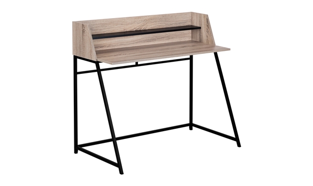 Look at your home office from a different angle with this computer desk featuring a storage hutch. Finished in a dark taupe wood-look laminate, the compact desktop has side panels that slant to seamlessly align with the attractive, trapezoid-shaped metal legs for a clean look. The hutch includes 1 long shelf in a contrasting black finish that is the ideal size to hold small items like wireless speakers or a block of sticky notes. Supporting the desktop is a sturdy metal base in black with a support bar on back that runs parallel to the shelf. This contemporary laptop or writing Table with a space-saving design is a great choice if you use your living room or bedroom as a home office.