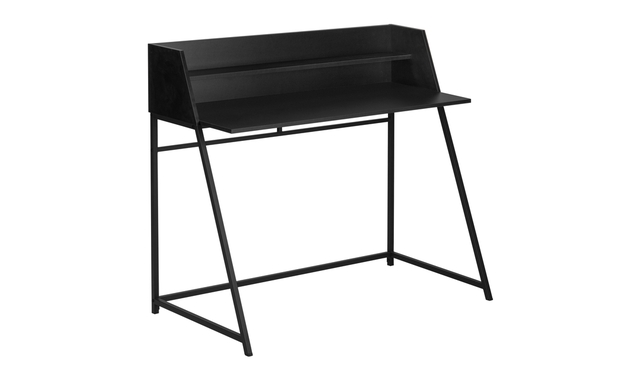 Look at your home office from a different angle with this computer desk featuring a storage hutch. Finished in a black laminate, the compact desktop has side panels that slant to seamlessly align with the attractive, trapezoid-shaped metal legs for a clean look. The hutch includes 1 long shelf that is the ideal size to hold small items like wireless speakers or a block of sticky notes. Supporting the desktop is a sturdy metal base in black with a support bar on back that runs parallel to the shelf. This contemporary laptop or writing Table with a space-saving design is a great choice if you use your living room or bedroom as a home office.