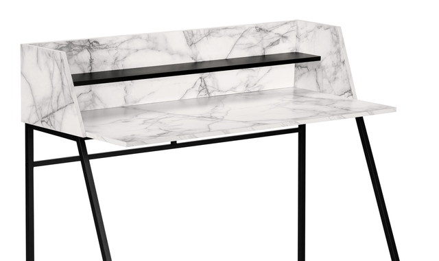 Look at your home office from a different angle with this computer desk featuring a storage hutch. Finished in a white marble-look laminate, the compact desktop has side panels that slant to seamlessly align with the attractive, trapezoid-shaped metal legs for a clean look. The hutch includes 1 long shelf in a contrasting black finish that is the ideal size to hold small items like wireless speakers or a block of sticky notes. Supporting the desktop is a sturdy metal base in black with a support bar on back that runs parallel to the shelf. This contemporary laptop or writing Table with a space-saving design is a great choice if you use your living room or bedroom as a home office.