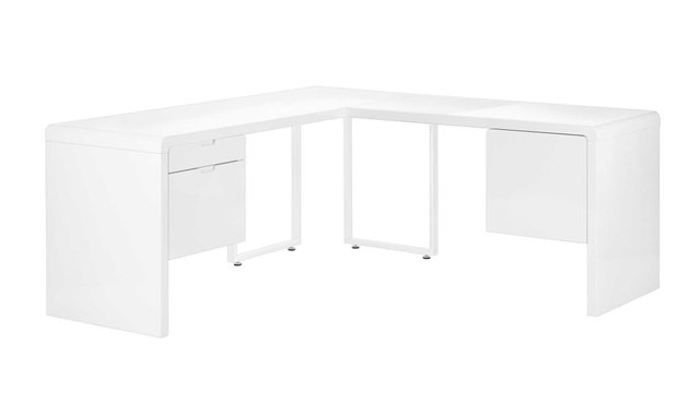 Give your home office a promotion with this extra-large, corner desk in a Gloss White laminate finish. The L-shaped desk is generously sized with a thick 1.5” desktop leading to a waterfall edge look. A reversible configuration lets you set up the desk with drawer units on either side as you wish. The space between the 2 storage drawers and the cabinet allows enough room to move easily around your workspace. Providing support are sturdy metal legs in a white finish. This L-shaped computer desk saves space when used in a corner, but is finished on all sides for a polished look when placed in a home office.