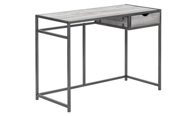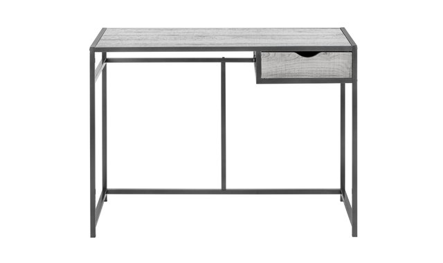This computer desk with 1 storage drawer offers simplicity in a space-saving design. The desk top offers space for the essentials you need to work. On the right, a storage drawer offers a place to keep small supplies. The drawer interior is finished in the same gray faux wood laminate as the desk panel and drawer exterior for a clean look. A metal frame in a coordinating dark gray finish delineates the desk top and drawer for a modern industrial touch. This writing table makes an excellent choice if your home office is in a living room or bedroom.