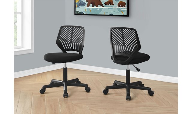 Designed specifically for children, this small black desk chair will provide your child with a supportive and comfortable place to sit while they work and play. It features an extra-wide ergonomic curve and backrest to promote good posture as well as a padded seat with a soft touch. A lever under the seat allows you to adjust the chair to the best height for your child. A swivel seat and 5-prong base with casters make moving the chair easy and fun! You and your child will give this juvenile office chair high marks for support, comfort, and functionality. No assembled.