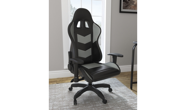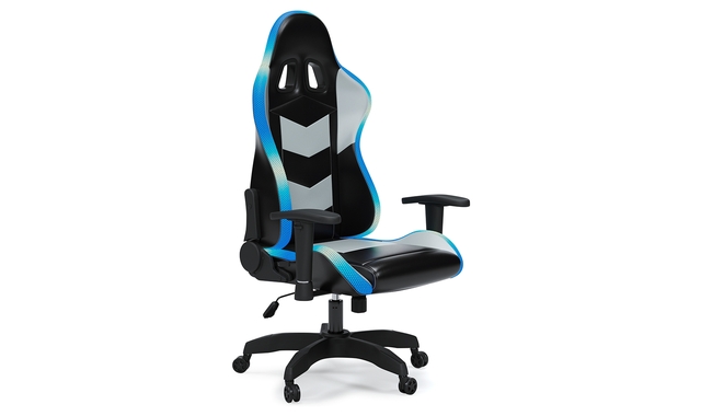 Tech this out: a swivel office chair that’s as cool as it is comfortable. The ultimate choice among gamers, the Lynxtyn swivel office chair is hard to beat. Quality crafted with a sturdy steel frame, this swivel office chair with comfy contoured seat and cutting-edge design is upholstered in a durable faux leather in gray and black. Cleverly integrated into the chair: powered LED lighting to enhance the gaming experience. Choose from six different colors or stream a mix of color using the remote control. With a swivel base, smooth-gliding casters and adjustable seat height/tilt feature, this office chair with fully reclining backrest has serious game.