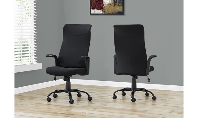 Add a contemporary touch to your workspace with this sleek black chair covered in durable and breathable polyester fabric. BIFMA-certified, this extended back office chair features a 360-degree swivel mechanism, a lever to adjust the seat height, and a lockable reclining mechanism to maximize your comfort. Ergonomically designed, well-padded seat and rounded armrests accented with grooved lines provide lumbar support and long-lasting comfort. Equipped with a black base on five hooded nylon casters for smooth movement. Assembly is required. Certified for personal and commercial use (BIFMA standards). Convenient seat height adjustment lever with lockable tilt mechanism. Durable, ventilated black fabric back and seat. Well-padded seat and ergonomic curved backrest provide a comfortable posture. Solid black base with five hooded nylon casters for mobility.