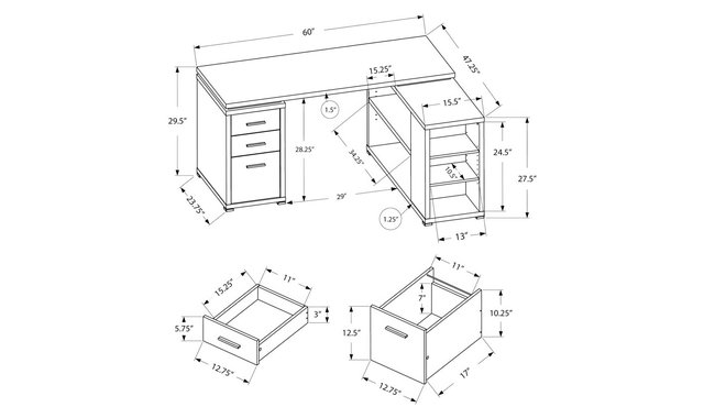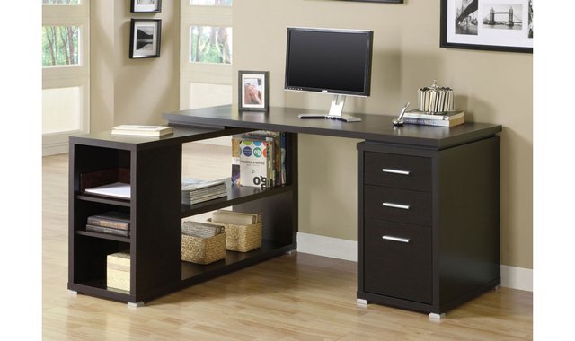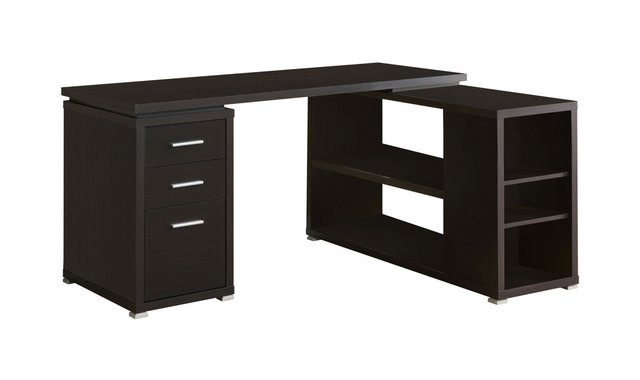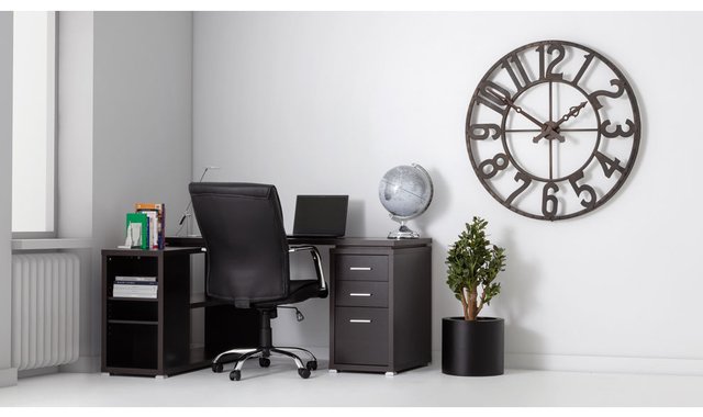This L-shaped corner desk in dark brown with a distressed wood finish is practical. It is reversible and can be set up to suit your tastes and needs, with the shelves on the left or right side. This multifunctional desk offers space for a computer and a lamp. Easily place photos, books or storage boxes in the empty spaces. Additional items shown in the picture are extra.