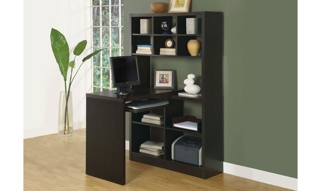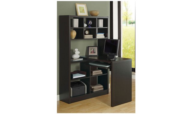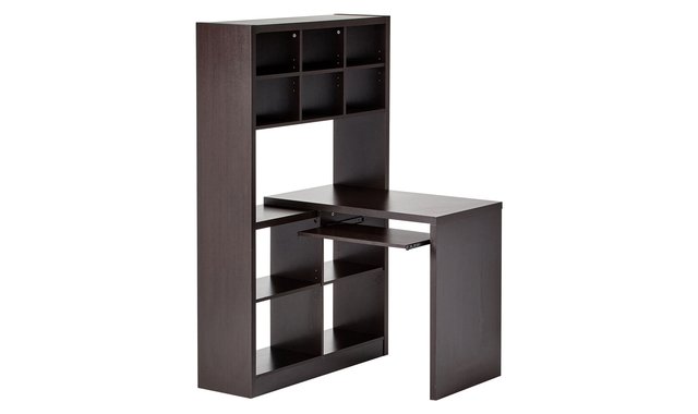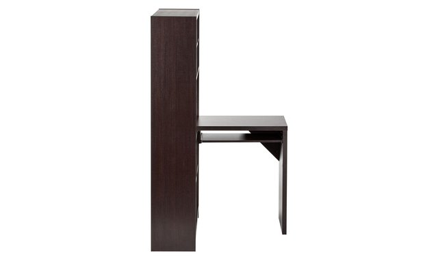 This unique, contemporary style desk and shelf unit offers the ideal combination for your home office. Finished on all sides in an elegant espresso, the thick paneled desk features an easy glide pull-out keyboard tray and ample side storage space which can be positioned to the left or right of the desk allowing you to customize your space as needed. The convenient attached bookcase with adjustable shelving provides plenty of space to store books, paperwork, or decorative objects. A versatile design piece to place anywhere in your home and office space.