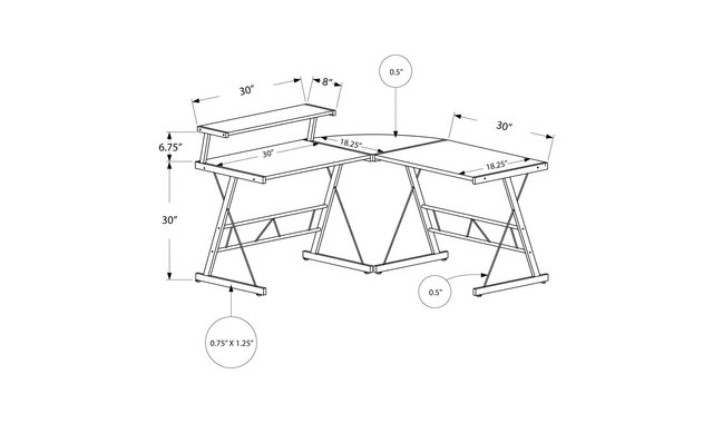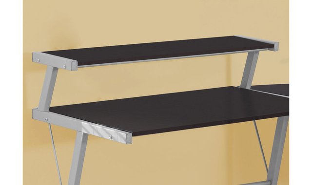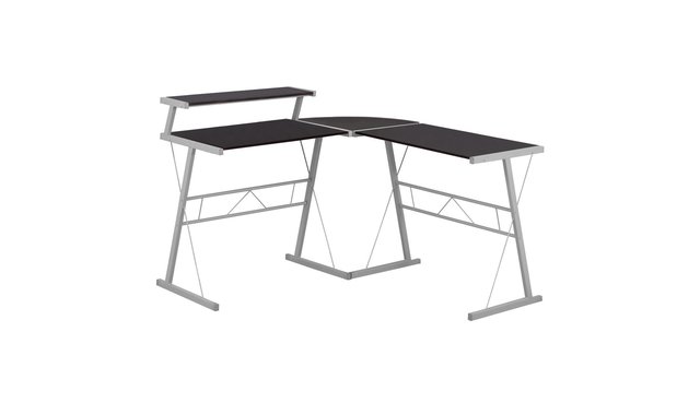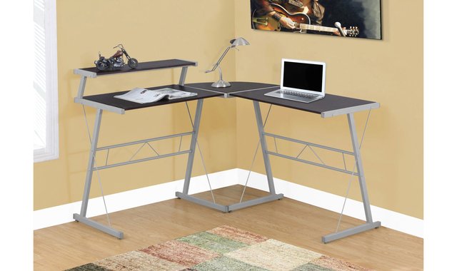 This contemporary and minimalist L-shaped desk will be a great addition to your workspace. Finished in a cappuccino colour with industrial-looking metal legs, this 3-piece set offers modernity and versatility no matter where you place it This generously proportioned unit will allow you to place your computer, lamp and documents without ever running out of space. The top shelf provides storage for books, supplies and decorative items. Browse the section below for more ideas.