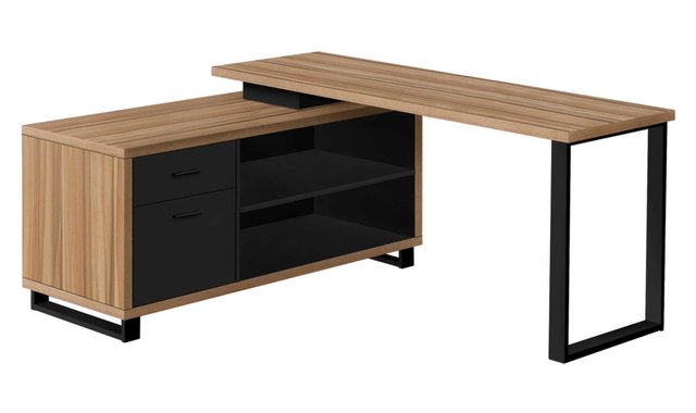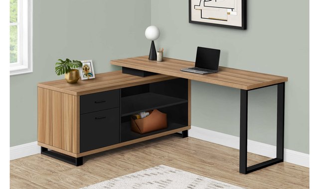 This stunning L-shaped executive desk will add style to any workspace. Finished in a Natural Wood Finish / Black, it features two storage drawers and two open shelves for a modern, minimalist design. The two-tier desktop provides ample workspace and storage for your office essentials. Sturdy black metal legs provide stability throughout. It’s the perfect computer desk for your home office. With this spacious, two-tone workstation, staying organized at home has never been so easy—or so stylish! L-shaped computer desk with storage, made from thick Natural Wood Finish / Black panels Open and closed storage areas include 2 shelves and 2 large drawers The desktop is divided into two sections: a large main work surface and a smaller raised surface above the storage unit Space-saving design is ideal for corner placement; finished on all sides for versatile positioning Assembly required: illustrated instructions and all hardware are included for convenience (additional tools may be required) Product dimensions: 72 in. W x 60 in. D x 31.25 in. H