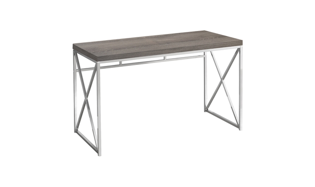Space saving is a breeze with this compact desk that is sized for small homes, apartments or condos. Featuring a modern, wide open design, this desk finished in a dark taupe wood look is equally functional as a computer desk or writing table. A sturdy chrome metal X-design base ensures stability and offers lots of space to push in a chair. The thick panel top is perfect for a laptop/tablet, a lamp, a notebook and some important supplies to get the job done.