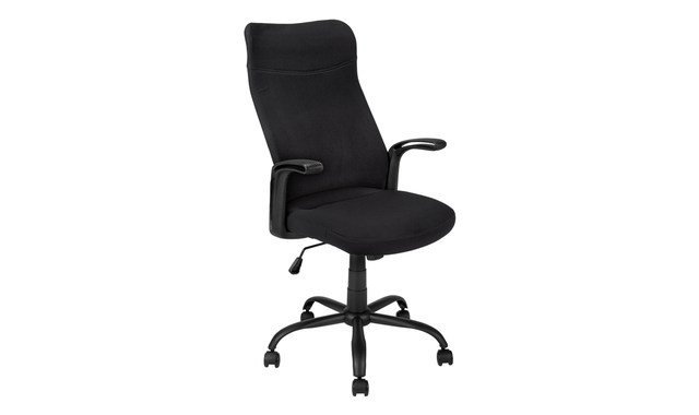 This executive office chair with fixed armrests in black works hard to deliver support and comfort. The ergonomically designed, high backrest with an integrated headrest is lightly padded, wide, and curves to promote good posture, while the padded seat is deep and wide to offer a roomy, comforTable feel. The adjusTable height lever with tilt control makes it easy to adjust the chair to your preference. Moving around your workspace is virtually effortless thanks to the swivel seat and the casters on the black 5-star base. Upholstered in a black fabric with minimal stitching, this contemporary task chair provides a comforTable place to sit as you work hard in your office.