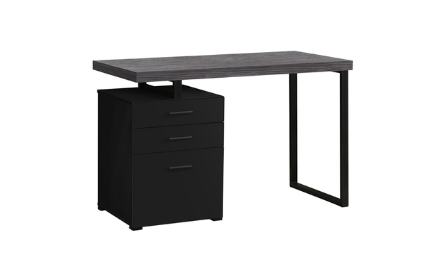 Maximize your home office space and your productivity with this computer desk with 3 storage drawers. The thick-panel floating desktop provides room for the essentials you need to work and allows you to use the top of the drawer unit as an extra surface. Finished in a black laminate that contrasts the grey desktop, the drawer unit includes 2 small drawers and 1 large drawer with a bar for hanging files and offers space for items you want to keep off the work surface. The drawer unit is reversible and can be installed on the left or right side according to your preference. Supporting the desk is a metal leg in a black finish with a modern, stylish U shape.