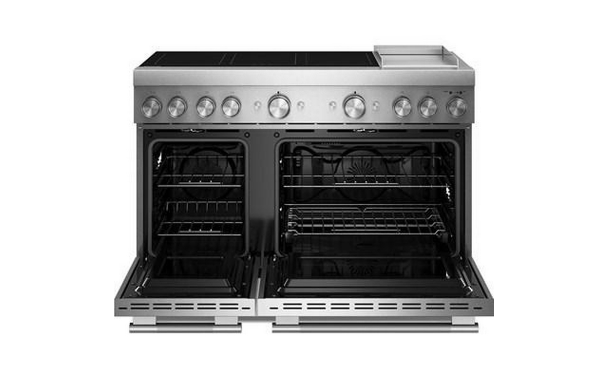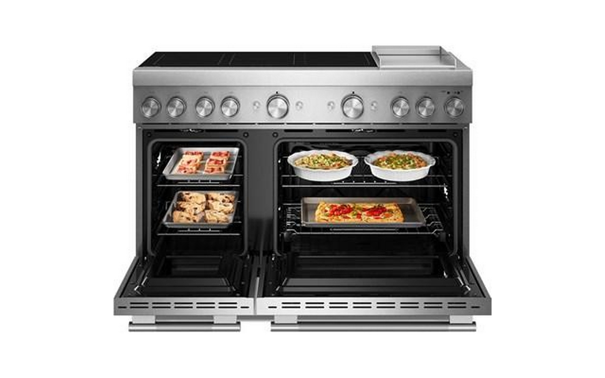 This KitchenAid® 6.3 cu. ft. 48-inch 6-Element Induction Freestanding Commercial-Style Range combines the precision of induction with the power of Air Fry. Sensor-induction cooktop generates heat directly within cookware, and the electric double oven features Even-Heat™ True Convection plus air fry mode that aids in crisping and browning.