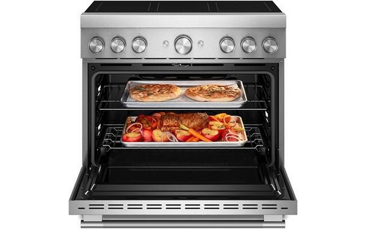 This KitchenAid® 5.1 cu. ft. 36-inch 6-Element Induction Freestanding Commercial-Style Range combines the precision of induction with the power of Air Fry. Sensor-induction cooktop generates heat directly within cookware, and the oven features Even-Heat™ True Convection plus air fry mode that aids in crisping and browning.