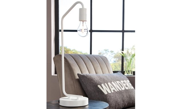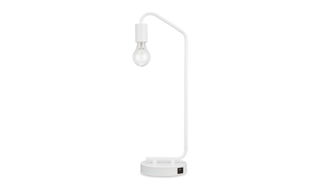 Brilliant in its minimalist form, this desk lamp suspends its exposed bulb in one sleek swoop. Constructed of metal, the compact, lightweight lamp is portable and features a single USB charging port. We see it glowing bedside, on a bookshelf or on either end of a credenza.