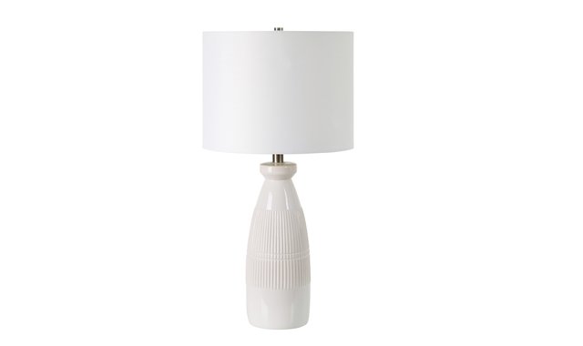 The classic interior takes on a modern, flowing elegance when this lamp is placed there. Measuring 26.25" tall by 13" wide and deep, it's tall in stature, but also in looks. The ceramic base, topped with an off-white cotton shade, features a shiny luster finish and finely etched lines. Desk lamp Ceramic Off-white finish Cord switch Max. 100W E26 socket Off-white shade Bulb included