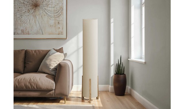 LIGHTING - 50"H FLOOR LAMP WOOD LOOK BASE / IVORY SKU#: I 9755 Add a touch of modern elegance to your home with this stunning 50"h floor lamp. The sleek cylinder base in a trendy brown wood look adds a contemporary flair, while the ivory linen tower shade creates a warm and inviting ambiance. The convenient on/off foot switch operates a single bulb up to 40W (not included), helping to easily illuminate a dim corner. This decorative accent lamp not only serves as practical lighting in a living room, bedroom, or office space but it also adds character to a room. Made with high quality materials, this floor lamp includes a 2 year limited warranty against any defects for your peace of mind. Only minor assembly is required, and you will be ready to brighten up your decor with this beautiful floor lamp with a fabric shade that is sure to be a conversation starter in any space.