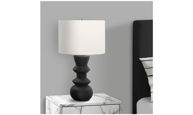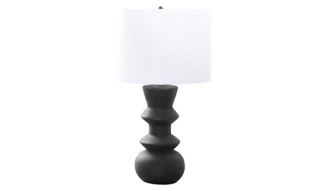 Add a touch of elegance to your living space with this stylish and trendy 26"h table lamp. The unique black ceramic textured finish base adds character and charm, while the chic, ivory fabric shade softly diffuses the light to create a warm ambiance, perfect for brightening any room. Whether placed on an end or side table, nightstand or bedside table, this decorative lamp houses up to a 100W tri-bulb (not included) to illuminate your space with its 3-way switch, allowing you to adjust the brightness to suit your needs. Made with high quality materials, this accent lighting includes a 2 year limited warranty against any defects for your comfort and satisfaction. Quick and easy to assemble, this fashionable contemporary lamp is ideal in an office, living room, or bedroom to enhance your decor.
