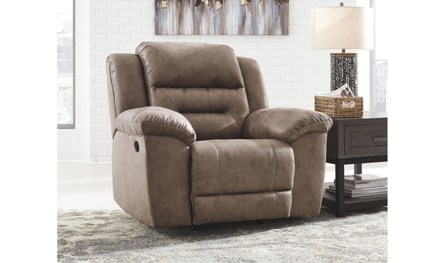 For those that love the cool look of leather but long for the warm feel of fabric, this rocker recliner delivers both with ease. Its high-performance padded faux leather is remarkably durable and easy to clean, just the thing for family spaces. Channel-stitched back cushions provide indulgent lumbar support for maximum comfort—not to mention fashion-forward flair.