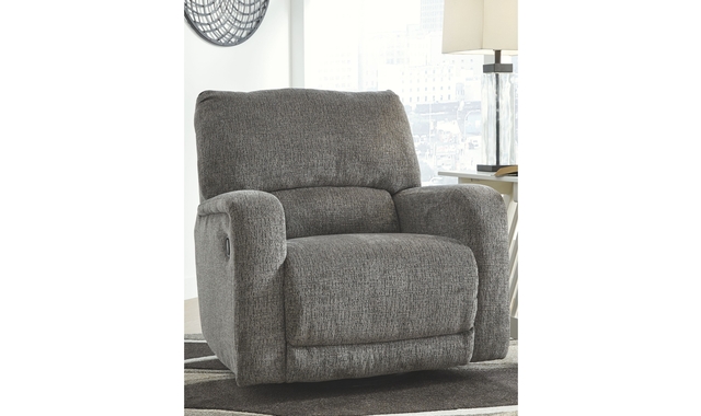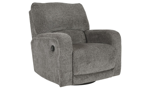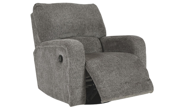 You and plush cushions are two peas in a pod. That’s why this swivel glider recliner will quickly find its way to your heart. Chenille fabric feels so good, you’ll never want to take your hands off of it. Track arms elevate the look with a touch of contemporary sensibility. Ease back into relaxation on the deep seating with one easy pull. Complete with 360-degree swivel, this recliner sets the bar for comfort.