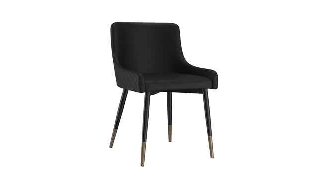 Modern dining chair with faux leather upholstery Diamond-patterned stitching detail on seat and back Black metal legs with aged gold-dipped detail Firm polyester foam cushion Approximate weight capacity is 300 lbs; seat height is 18.5"