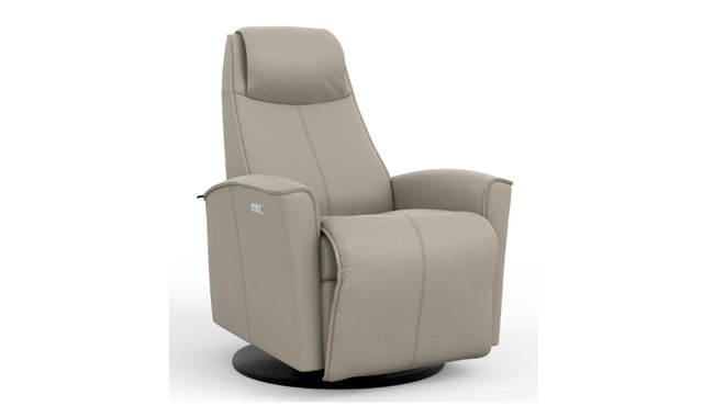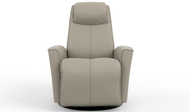 Power rocking and swivel reclining armchair in full leather. Norwegian Design. Manually adjustable head rest.