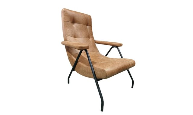 Relax in comfort with this retro upholstered lounge chair in tan and black metal.