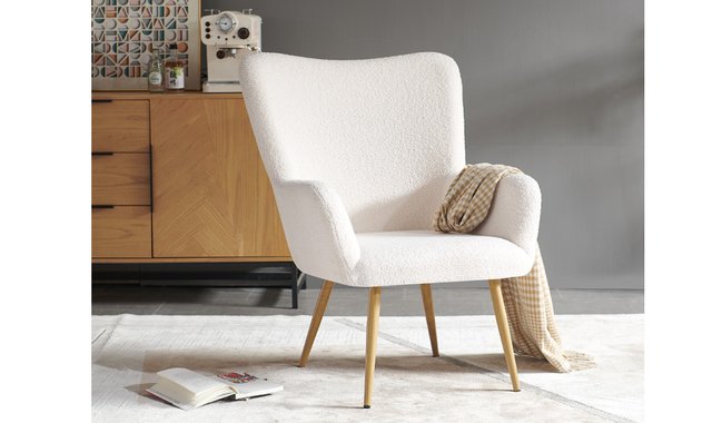 The Emile armchair has fine upholstery and slightly flared armrests. It’s a lightweight and updated take on the traditional bergère armchair, featuring taller legs.