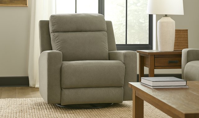 The Forest Hill reclining rocking and swivel chair from Palliser combines modern comfort with timeless design to suit any interior. Covered in a soft, hard-wearing gray fabric, it offers a sober, elegant aesthetic that perfectly complements contemporary or classic decors.