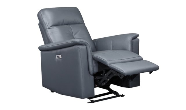 Power reclining armchair Exquisite blue-grey top grain leather upholstery with faux leather-match covers the chair