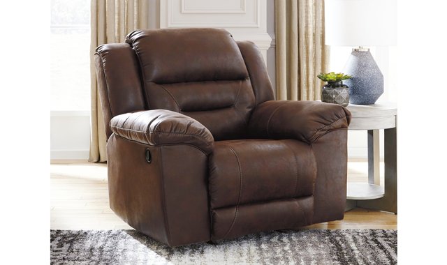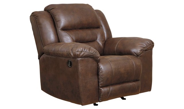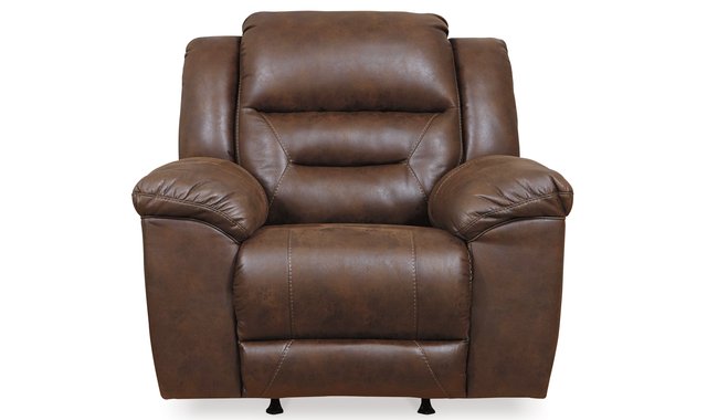 For those who love the cool look of leather but long for the warm feel of fabric, this rocker recliner delivers both with ease. Its high-performance padded faux leather is remarkably durable and easy to clean, making it just the thing for family spaces. Channel-stitched back cushions provide indulgent lumbar support for maximum comfort—not to mention fashion-forward flair.