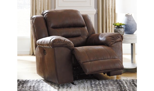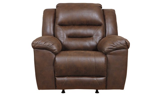 For those who love the cool look of leather but long for the warm feel of fabric, this power rocker recliner delivers both with ease. Its high-performance padded faux leather is remarkably durable and easy to clean, making it just the thing for family spaces. When it’s time to relax, the one-touch power control puts the perfect position at your fingertips. Channel-stitched back cushions provide indulgent lumbar support for maximum seating comfort—not to mention fashion-forward flair.