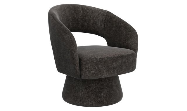 Modern bucket-style chair with full 360° swivel Plush, textured chenille fabric Sturdy upholstered pedestal base Medium-soft comfort polyester foam cushion Approximate weight capacity is 300lbs; seat height is 18.5" Dimensions: 28 x 25.75 x 31.25"H