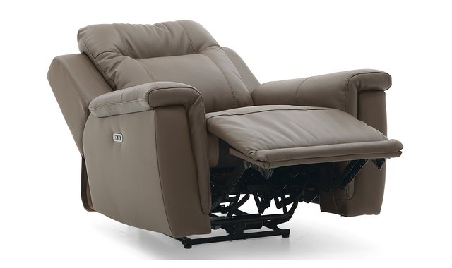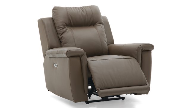The Riley motorized rocking and reclining chair by Palliser in greige leather combines modern elegance with exceptional comfort. Upholstered in soft, durable leather, it seamlessly fits into any contemporary or classic decor. Featuring a motorized reclining mechanism and an adjustable electric headrest, it provides personalized support for unmatched relaxation. Its premium foam cushioning ensures lasting comfort, while the built-in USB charger adds a touch of practicality. The Riley chair is the perfect blend of style, functionality, and well-being.