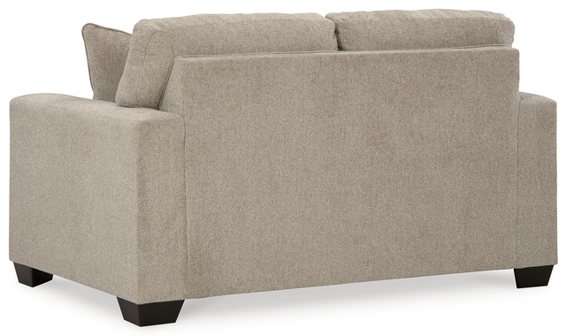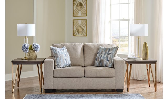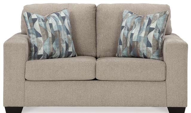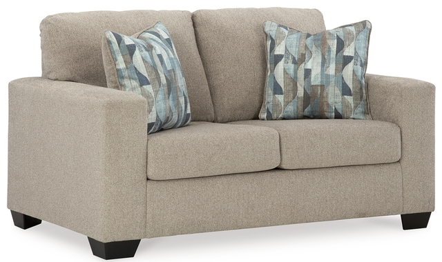 You’re in for a neat treat with this loveseat. Its comfy seats are covered in soft, textural upholstery, and the wide track arms are eager to support your quest for total relaxation. Distressed abstract toss pillows bring a fresh breath of contemporary style while accentuating the loveseat's color.