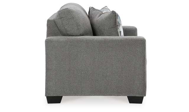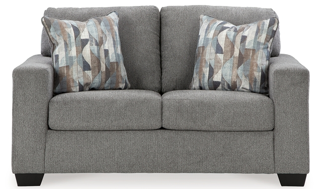 You’re in for a neat treat with this loveseat. Its comfy seats are covered in soft, textural upholstery, and the wide track arms are eager to support your quest for total relaxation. Distressed abstract toss pillows bring a fresh breath of contemporary style while accentuating the loveseat's color.