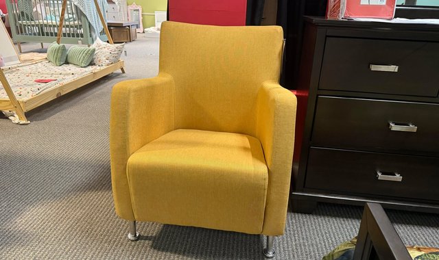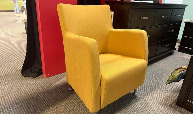 This chair is a modern and elegant chair, covered in bright yellow fabric. It has slightly flared armrests that give it a contemporary and inviting look. The backrest is straight with a slight backward tilt for added comfort. The legs are short and made of chrome metal, which adds a modern and refined touch to the piece. This chair, both simple and stylish, would be ideal as an accent chair in a living room, office, or even a bedroom.