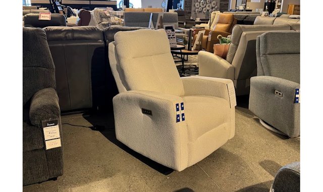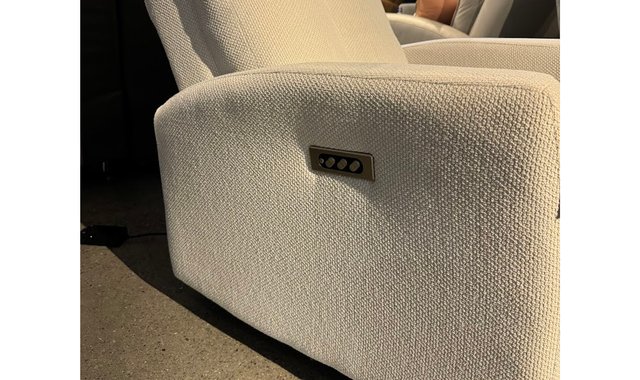 Rocking fabric armchair with motorized recline. Electric adjustable headrest. Adjustable lumbar support. Made in Quebec. Liquidation demonstrator, sold as seen in store