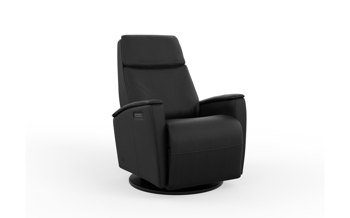 Power rocking and swivel reclining armchair. Norwegian Design. Manually adjustable head rest.