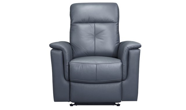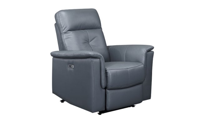 Power reclining armchair Exquisite blue-grey top grain leather upholstery with faux leather-match covers the chair