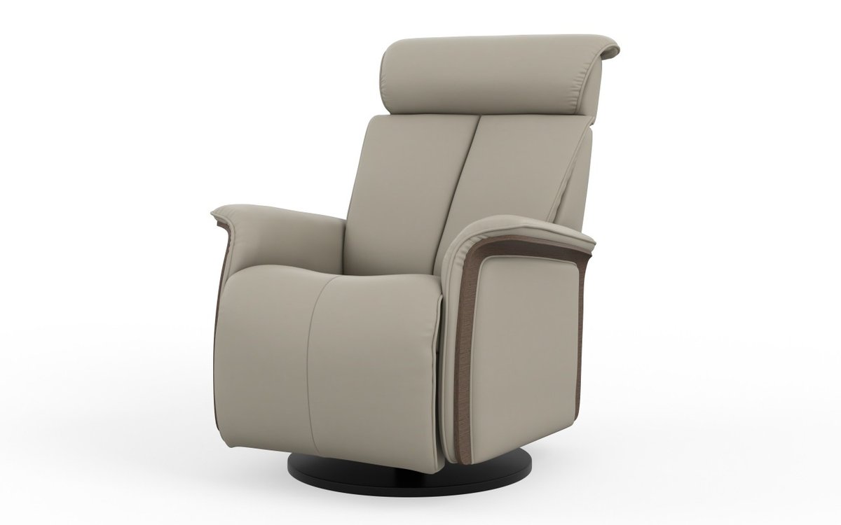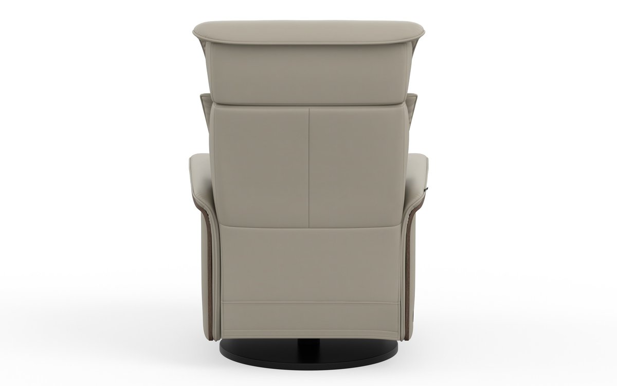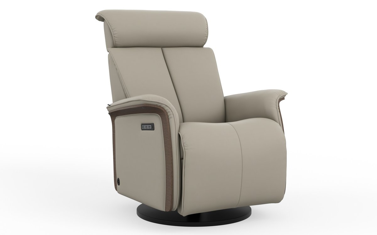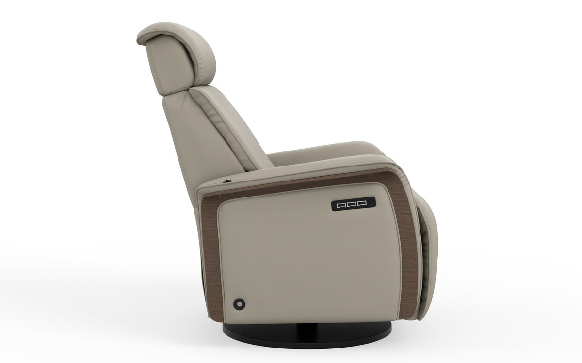 The Fjords Jewel swing relaxer features a 3-motor system: one for the motorized reclining and footrest, a second for the motorized lumbar, and a third for the adjustable headrest angle, ensuring correct ergonomic support. For added convenience, it includes both a magnetic charging port and a USB-C port. A refined oak wood panel on the side enhances its elegant design. The Jewel is available in two sizes, small and large and features a laminated oak veneer.