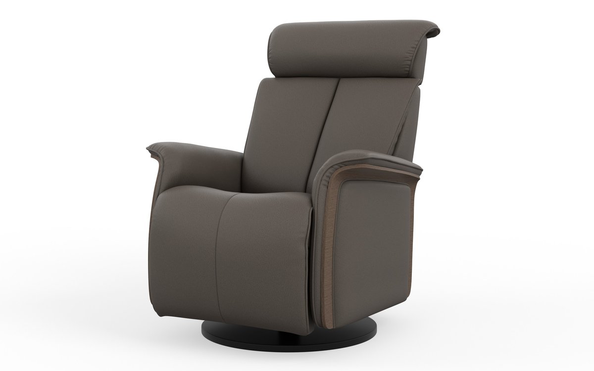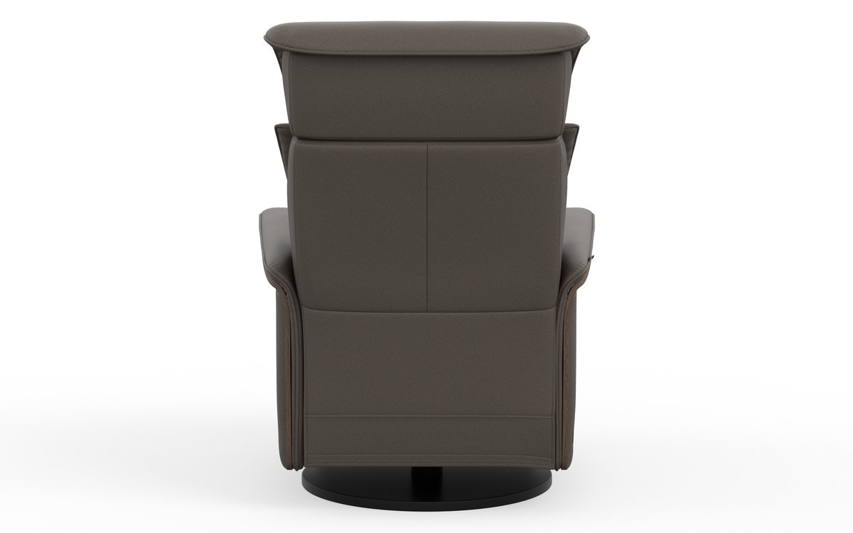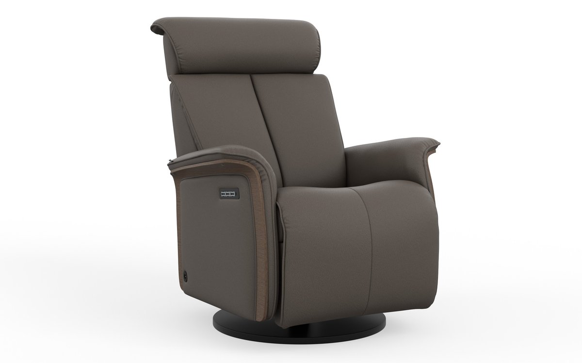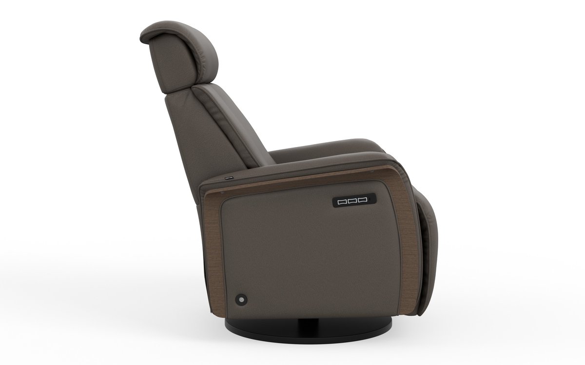 The Fjords Jewel swing relaxer features a 3-motor system: one for the motorized reclining and footrest, a second for the motorized lumbar, and a third for the adjustable headrest angle, ensuring correct ergonomic support. For added convenience, it includes both a magnetic charging port and a USB-C port. A refined oak wood panel on the side enhances its elegant design. The Jewel is available in two sizes, small and large and features a laminated oak veneer.