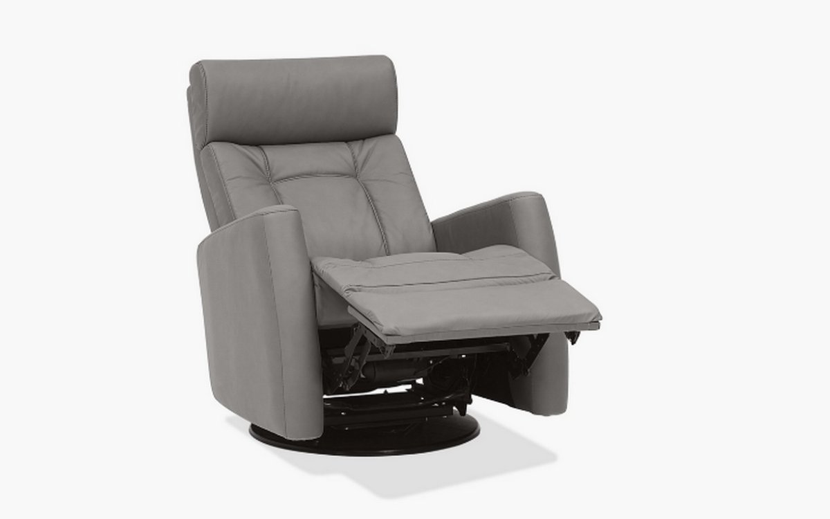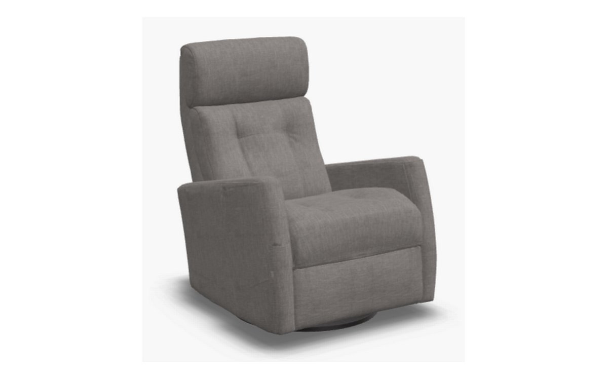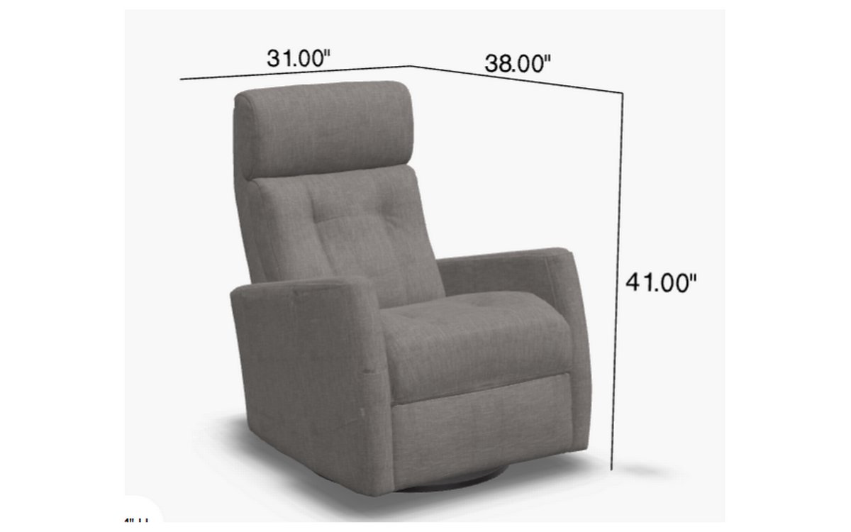 Motorized recliner with a motorized headrest. It rocks and swivels. It is upholstered in gray fabric.