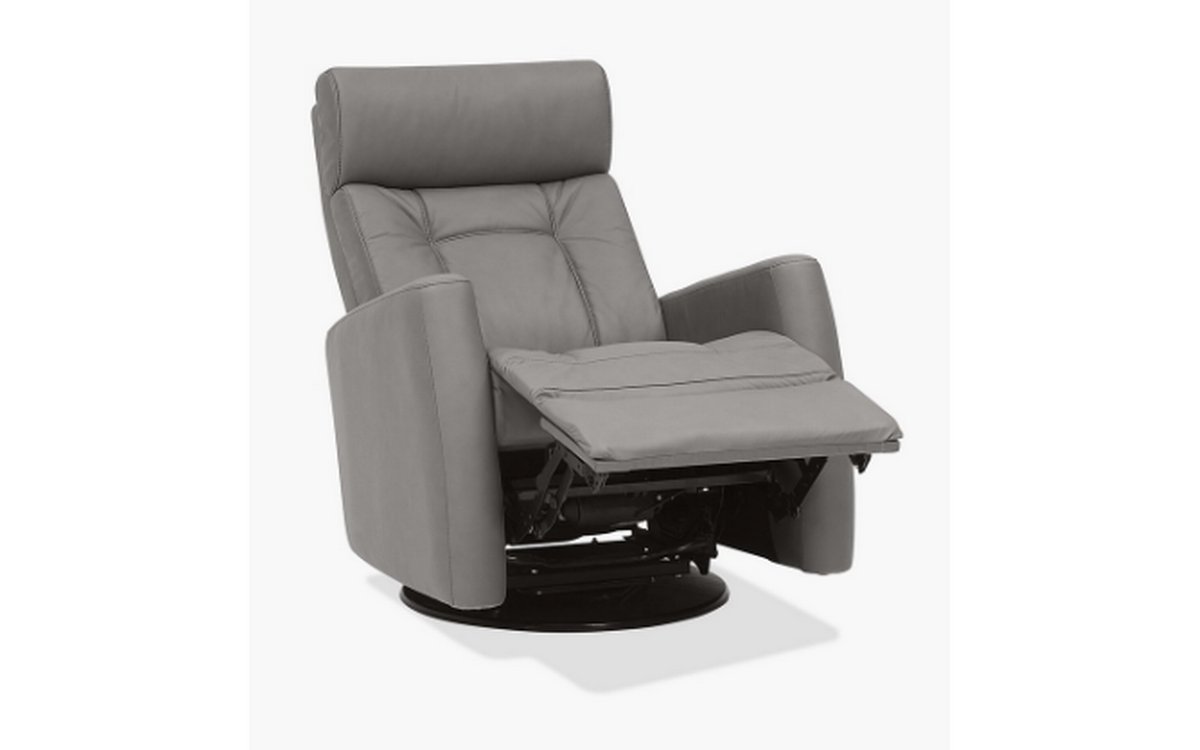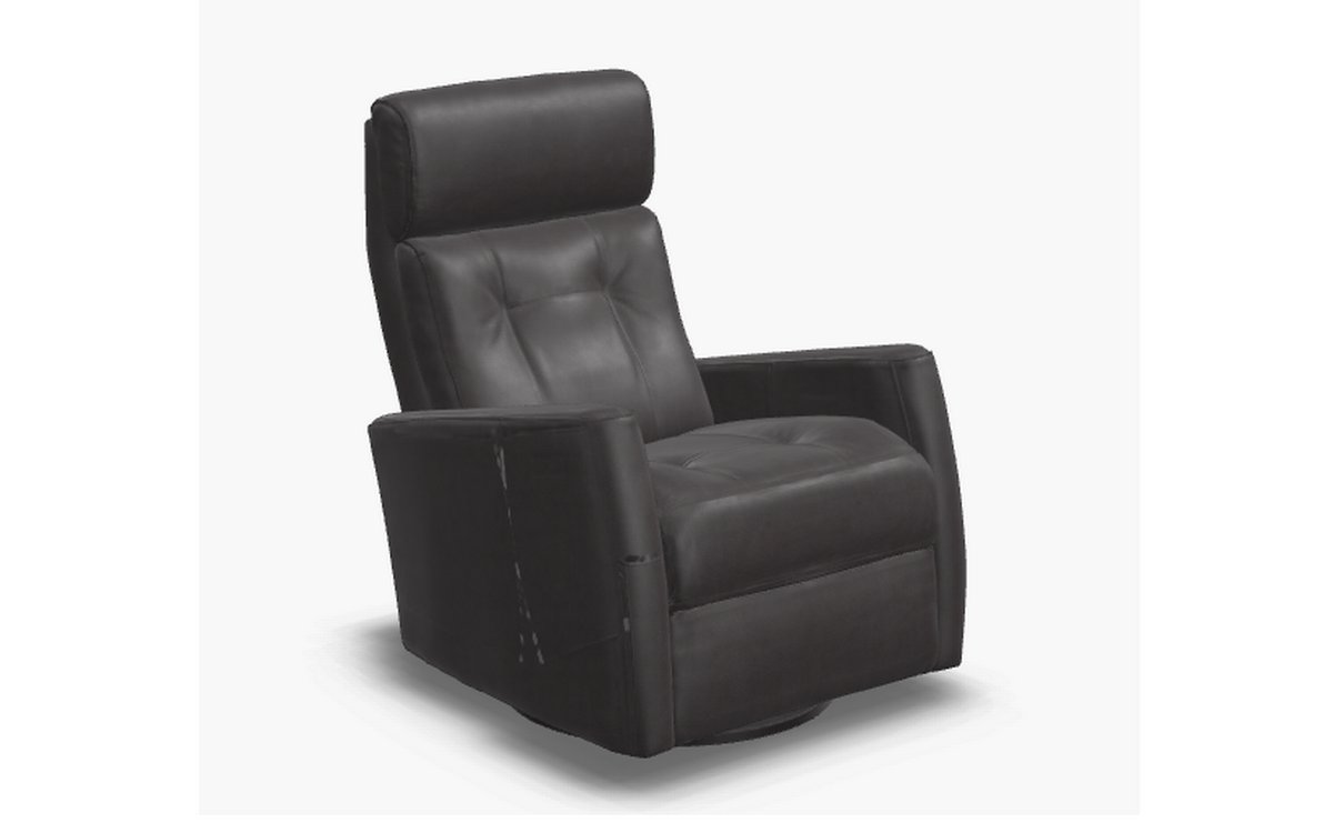 Motorized recliner with rocking and swivel functions. It is made of black leather.