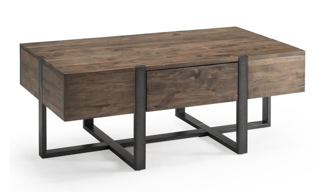 Industrially simple table design showcases hardwood veneer, hardwood solids in a rustic honey finish with a distressed iron base. Prescott marries the informality of rural farmhouse with an urban loft.