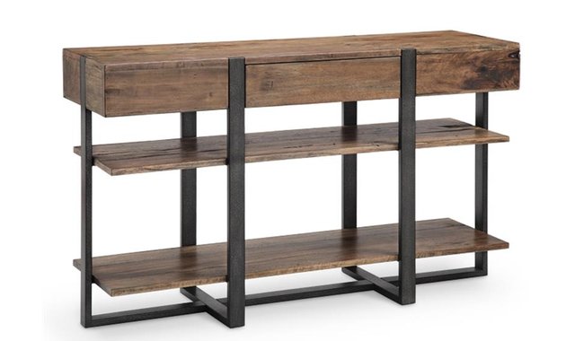 Industrially simple table design showcases hardwood veneer, hardwood solids in a rustic honey finish with a distressed iron base. Prescott marries the informality of rural farmhouse with an urban loft.