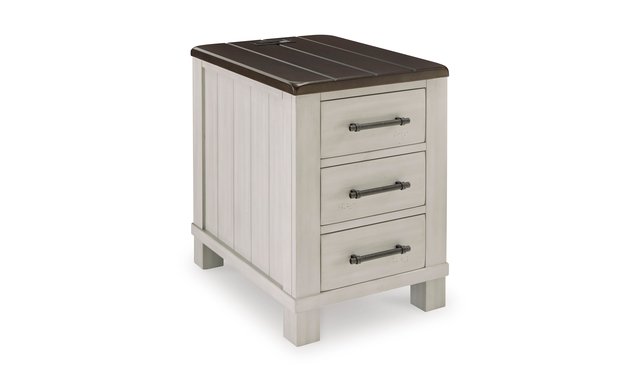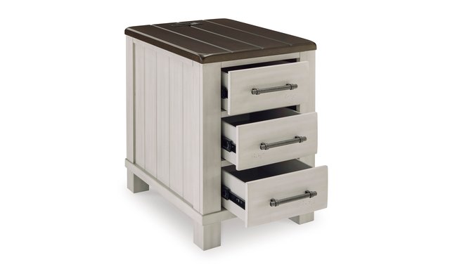 Make a farmhouse-inspired statement with this end table. Beautifully crafted to stand the test of time, the planked effect and clean two-tone finish lend a relaxing vintage feel. Spacious storage drawers with metal pulls double up on form and function. Plus, this end table's dual USB charging ports keep up with your high-tech lifestyle. Made with solid acacia wood, cherry veneer and MDF substrate Glazed light gray painted finish with brown cherry-stained top 3 drawers with fully finished interiors and ball-bearing side glides Metal bar pulls with aged iron-tone finish Subtle handmade distressing marks for added character and charm Tabletop with planked wood effect 110V power supply with dual USB charging port Power cord included; UL listed Assembly required