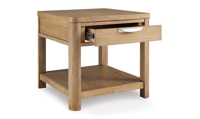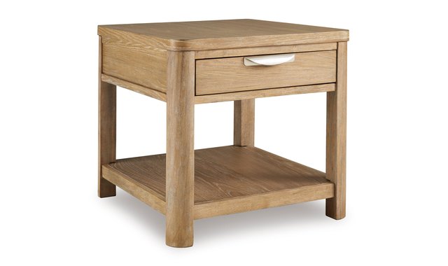 This end table's classic yet contemporary good looks are hard to deny. Softly shaped posts with a light oak finish and wire-brushed wood grain texture lend an organic appeal to your soothing space. A roomy drawer caters to additional storage needs while keeping clutter at bay. Plus there's plenty of display space on the lower shelf for treasures from your latest vacation.