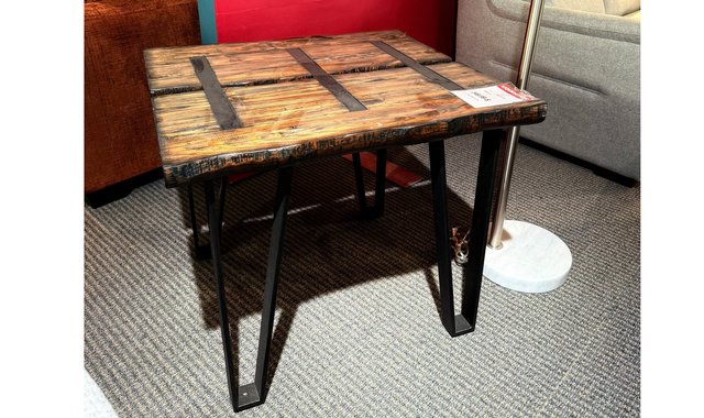 Rustic Wood & Metal Accent Table Add a touch of authenticity to your space with this bold and character-rich accent table. The top is crafted from reclaimed wood planks with a raw, weathered finish that highlights natural imperfections and time-worn charm. Black metal bands create an industrial contrast and visual interest. The angled black metal legs provide sturdy support and style, making this piece ideal as a side table or accent table in a living room or office.